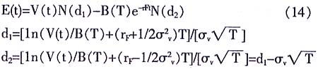 σV是公司资产价值的标准差,它反映了公司资产的风险程度。因此,股票的价值受公司价值(V(t))、司债的到期值(B(T))、无风险利率(rF)、公司债务的期限(T)和公司资产价值的标准差(σV)这五个变量的影响,其中B(T)、rF、T为已知,V(t)由市场决定,σV可由公司价值的数据估计。而且,公司的预期收益率和投资者的风险偏好不影响股票的价值,进入估价公式的风险因子σV是公司的总风险。