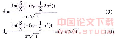 其中:C是欧式看涨期权的价格,S是股票价格,X为期权的执行价格,t是期权距到期日的时间,rF为无风险利率, N(d1)和N(d2)表示累积正态密度函数,