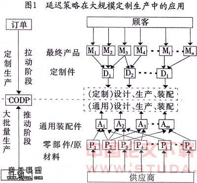 图1表示了延迟策略在大规模定制生产中的应用。在客户订单分离点CODP以前,生产系统按计划推动生产,主要生产标准零部件及其通用零部件,而在CODP以后,由客户订单拉动生产过程。