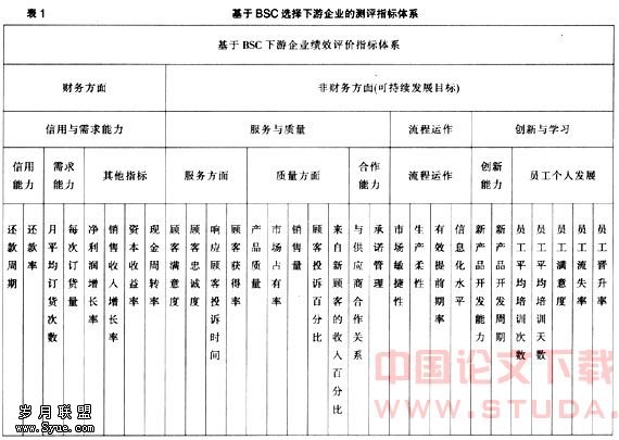 在全球化竞争的环境下,供应商与制造商越来越注重合作伙伴关系,越来越重视供应链的可持续发展,因此作为核心企业的供应商可根据自身具体的战略目标,在选择下游企业作为其战略合作伙伴时制定具体的二级指标,再选择合适的方法(如层次分析法、模糊数学法、神经)进行评价,评价的目的不仅仅是对供应商的经营成果进行评价,更重要的是站在供应链整体战略发展的角度为将来的绩效改进提供依据,以提升供应链的整体竞争能力,实现供应链成员利益最大化。这也是后续将研究的内容。