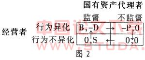 (4)经营者行为异化,而国有资产代理者监督。此时国有资产代理者得益为O(因为国有资产代理者执行自己的职责没有失职也没有获得额外收益,因此其得益为O);而经营者的得益为-P(因为经营者行为异化,而此时国有资产代理者实施监督,经营者受到惩罚,其得益为-P)。