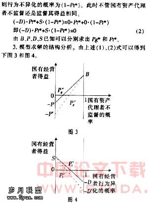 (1)经营者行为不异化,且国有资产代理者不监督。此时国有资产代理者的得益正效用为S(因为国有资产代理者可以利用不监督的时间、精力从事与本职工作无关的事情而获利为S,并且S>O);而经营者人员得益为O,(因为他们除了获得合法收入以外,没有获得其他非法收入,因此其额外得益为O)。
