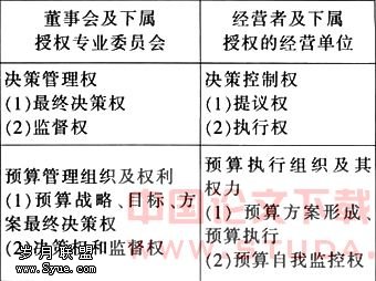 如何设计预算组织是实施预算控制必须解决的一个问题,具体在预算组织的设置上,必须体现董事会与经营层两个核心组织的内部权力制衡关系,按照两权分离的原则,董事会具有决策管理权,而经理层则拥有决策控制权。具体权利划分如下表: