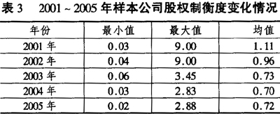通过表3看出,2001~2004年,不论从最大值上看还是从均值上看,样本公司的股权制衡度在逐年下降,只是2005年有所回升,但幅度也不大。民营上市公司股权制衡度在整体上呈现出下降趋势。