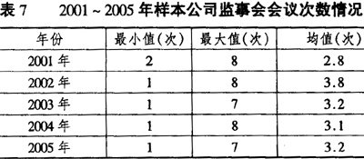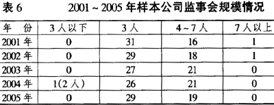 从表6数据可以看出,基本上所有的样本公司都按照证监会的要求设立了3人以上规模的证监会(2004年有一家上市公司的监事人数为2人,查询该公司年报属于临时性人员缺失)。但同时也可以很直观地看出,大部分上市公司仅仅设立了3名监事会成员,一名监事会主席,两名监事。2003年和2004年,4~7人规模监事会的公司有所增加,2005年又有所减少。这在某种程度上反映出很多上市公司并不是出于积极改善企业治理水平而主动设立监事会,而是出于相应证监会的规则要求。同时这也反映出,几年来监事会工作并未显现出真正的成效,并没有给上市公司治理带来显著的有益帮助,否则出于自身发展的考虑,上市公司应该会增加监事会的规模,更好的帮助公司发展。
