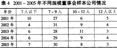 从表4数据可以看出,全部上市公司的董事会规模都满足证监会的要求,但五年中绝大多数公司的董事会规模都集中在7~9人,其次是10~12人的规模,我们认为这样的董事会规模是比较合理的。只有使董事会规模维持在一个合理的水平,才能既保证决策质量又不影响决策效率。