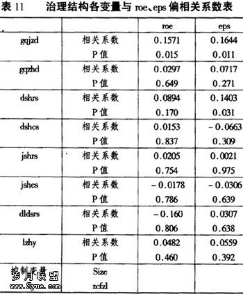 运用SPSS11.0 for Windows分析软件,以企业规模(size)和企业资产负债率(zcfzl)作为控制变量,对所有变量之间的相关关系进行分析,其中治理结构各变量与企业净资产收益率的相关关系如下表所示,与每股收益的相关关系也列出来作为参照对比。