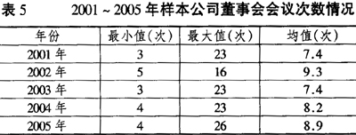从表5可以看出,五年来上市公司的董事会工作努力程度基本上维持在大体相当的水平,均值在8~9次左右,达不到每月召开一次的水平,最少值3~4次左右,相对来说这样的董事会工作勤勉程度不高。还有一种解释是,由于很多民营企业的董事都在企业任职,因此很多问题通过日常的经营管理会议就决策了,因而没有单独召开董事会。这也是在我国民营企业中,所有权和经营权未实现完全分离的情况下的可能解释。