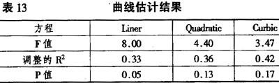 根据表13的结果,只有Liner模型通过了5%的显著性水平的检验,所以我们选择Liner模型建立回归方程。本文用y表示企业绩效指标净资产收益率,用x表示股权集中度,即第一大股东持股比例。这样,建立的回归模型为:
