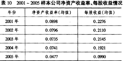 通过表10数据可以很看出,2001~2005年样本公司净资产收益率和每股收益的均值都在逐年下降,而且2005年下降的幅度最为明显。这说明,虽然近几年来我们一直在强调改善上市公司治理的状况,但是民营上市公司的绩效并没有的得到真正的改善。