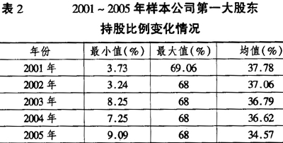 通过观察表2数据可以看到,不管从最大值来看还是从均值来看,民营上市公司第一大股东持股比例逐年降低,而且下降的幅度也呈逐年加快的趋势,以2005年为例,第一大股东持股比例平均下降幅度接近2个百分点;同时,从最小值来看,第一大股东的持股比例从总体上在提高,其中2003年较2002年有显著提高,2005年再次提高,最小值达到了