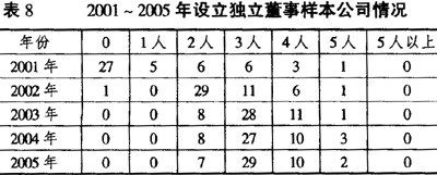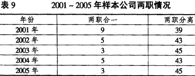 从表8可以看出,在2001年,上市公司仅有少数公司设有独立董事。2002年之后除了有一家公司没有设立独立董事之外,其他公司都设立了独立董事。2003年之后,所有的公司都设立了独立董事,而且都在2人以上。这主要是因为2001年8月16日,证监会发布了《关于在上市上市公司设立独立董事制度的指导意见》的通知,规定在2003年6月30日之前,上市公司董事会成员中应当至包括至少1/3的独立董事,而前面分析的董事会规模一般在7~9人,因此独立董事的人数基本在3人左右,基本达到了证监会的要求。我们也看到,独立董事的人数基本上都集中在2人或3人,4人的不多,5人的也很少,没有超过5人的公司。 (5)两职情况。本文选择两职合一和两职分离的公司数,作为上市公司治理结构变化情况指标。