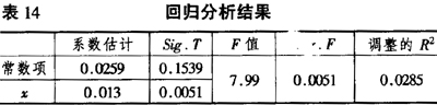从回归分析的结果来看,方程总体通过了给定的1%的显著性水平检验,说明方程设计比较合理。变量x的系数估计值通过了1%的显著性水平检验。方程调整的值较小,但是在样本总体足够大的情况下,允许调整的值比较小。回归结果表明,民营企业绩效与股权集中度具有显著相关关系,根据回归结果,列出方程为: