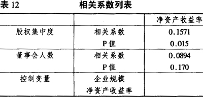 根据表12的数据结果,可以得到初步结论,股权集中度与净资产收益率存在正相关关系(P=0.015<0.05),说明随着股权集中的增加,企业绩效会提高。这就验证了假设1。