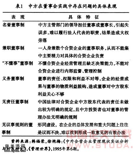在合资企业,中外双方董事既要为了企业的发展通力合作,也要为了母公司的利益而各为其主。但总起来看,外方处于“上风”,而中方常处于“下风”。一是股权结构及其变化趋势有利于外方控股。笔者在研究中发现,通常在合资初期,大都数情况下还是外方控股的为多,除非是国家有关规定约定的特殊行业和特殊企业必须由中方控股。即使合资时初始股份相等,未来股权变化的趋势也是有利于外方的,这是由于中方在外方增资时往往无力增资(一方面,中方母公司效益欠佳,而银行又在惜贷,在此情况下,中方母公司拿不出钱来增资;另一方面,中方增资要进行申请,手续比较烦琐,甚至有时还得不到主管部门的批准),或者是增资速度和规模无法与外方抗衡,从而导致股权的部分丧失,中方对合资公司的掌控权逐步减弱。二是外方掌握关键技术又比较精于管理和运作,从而在合作博弈中处于占优位置。中方董事多年饱受传统计划管理模式的束缚,缺乏公司的管理经验,不熟悉与外方的博弈技巧,因此,在互相监督中处于弱势地位,难以对外方董事构成实质性的威胁。表1显示了中方董事的若干弱点,很能说明问题的严重性。三是外方董事和中方董事既得利益的巨大反差,使得中方董事有被外方收买的危险。在笔者实证调查中,就有不少的案例。一旦出现这种情况,中方董事就会自动放弃监督,对外方损害中方利益的事情听之任之,中方的监督形同虚设。