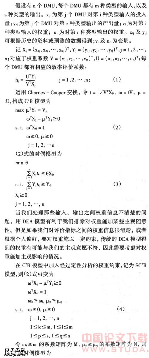 这样在本来完全是定量分析的DEA模型中,加入经过定性分析的权重因素,使我们在对某些评价指标很熟悉的时候,可以对该指标的权重进行约束。如果不熟悉则可以不用考虑约束,避免主观评价所固有的缺陷,这样新模型就兼有主观评价与客观评价两者的优点,具有更大的灵活性和可操作性,便于评价人员自主选择运用。