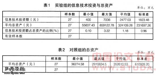 当前,我国正在加速推进企业的信息化,以信息化带动化,用高新技术改造传统产业是我国工业化的基本战略。随着信息技术投资的大量增加,人们日益关注信息技术投资对于公司绩效的影响,也就是信息技术投资是否会带来公司绩效的相应提高?如上所述,我国的一些上市公司进行了比较大规模的信息技术投资,信息技术投资是否带来上市公司绩效的提高?由于信息技术的产出很难单独计量,信息技术投资的效益体现在公司整体效益中,上市公司的绩效除了受到信息化应用水平的影响,还受到许多其他因素的影响,研究信息技术投资对上市公司绩效的影响,除了研究进行信息技术投资的公司绩效的变化,同时也需要对比没有进行信息技术投资的公司的绩效,也就是进行实验组(披露进行信息技术投资的公司)和对照组(没有披露进行信息技术投资的公司)之间的对比分析。本文利用中国上市公司资讯网得到了27家披露进行信息技术投资的数据,同时又按照27家样本企业所属行业的情况采用分层抽样的方法抽取了27家公司作为对照组。为了研究信息技术投资对我国上市公司绩效的影响,提出以下研究假设: