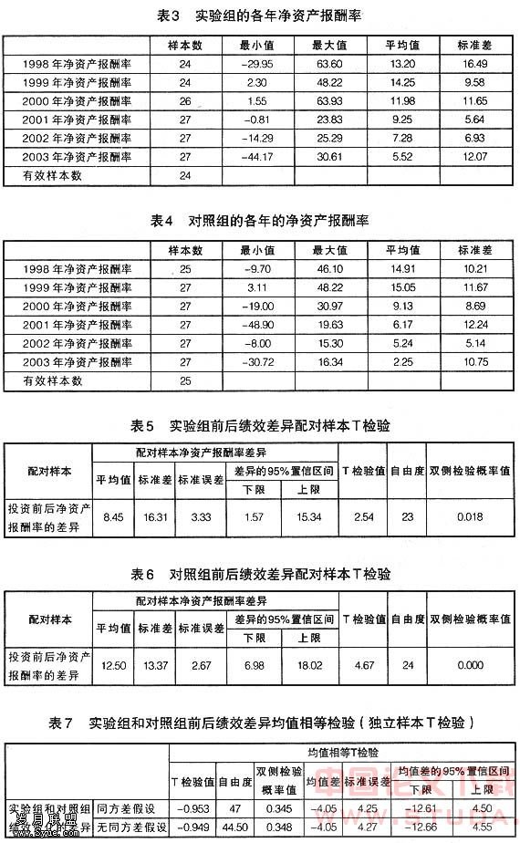上市公司的绩效受到多种因素的影响,除了信息技术的投资和应用外,还受到国家宏观环境、市场竞争状况、企业的技术水平和技术能力、企业经营管理水平、企业的财务状况等多种因素的影响。用1998年和1999年的净资产报酬率的平均值表示信息技术投资前上市公司的绩效水平,用2003年的净资产报酬率代表信息技术投资后的公司绩效,前后对比可以反映绩效的变化,其中既包括信息技术投资的影响也包括其它因素的影响。由于信息技术投资的效益难于单独估计,所以需要通过实验组与对照组的比较消除其它因素的影响,由于对照组是考虑了实验组公司的产业类型并随机选取的,基本可以保证实验组和对照组的可比性,通过实验组前后效益的变化减去对照组前后效益的变化,可以将除信息技术投资以外的其因素对绩效的影响消除,从而得到信息技术投资对公司绩效的影响。