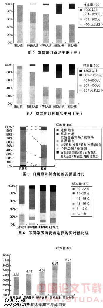 食品和日用品一般属于生存性消费资料,在家庭消费支出中是最基本的支出。而不同收入层次的家庭,其消费结构中各种消费资料所占的比重有一定的差异。 研究发现,在食品支出方面,各组中都有三至四成左右的消费者每月家庭食品支出在400-800元之间,尤其是占总体半数以上的中等收入组和较低收入组在食品支出上的差异并不明显,中等收入组的食品支出平均每月568元,而较低收入组为444元,如图2所示。由此可见,食品作为最基本的生存消费资料,不同收入层次的家庭的总支出不会有太大的差异,而“物美价廉”一直是超市食品消费者们最核心的价值追求。