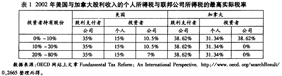 表1显示了美国和加拿大两国关于股利收入的个人所得税与联邦公司所得税的最高税率。其中,加拿大对股利所得的个人所得税税率为31.34%,远高于美国目前的15%;而公司间股利所得税,加拿大对于持股比例为10%以上的公司免征。假如在两国同时存在一个集团公司,处于集团顶层的控股人控制了子公司a的51%股份,而子公司a又控制了子公司b的51%的股份,以此类推,直至子公司e控制了子公司f的51%的股份。子公司f派发股利时,这一股利在f已缴纳了35%的公司所得税,当股利沿着控股链条向上派发时,每一环节都要再适用7%①的公司间股利税,最终,处于集团顶层的控股人还要以15%的税率缴纳个人所得税,综合起来,他从子公司f收到的股利的实际税率为1-(1-0.35)×(1-0.07)5×(1-0.15)=61.6%。可见,控股链条越长,最终的实际税率越高。如果子公司f的股利直接支付给个人投资者,那么其最终的税率不过是1-(1-0.35)×(1-0.15)=44.74%。本质上,对公司间股利所得的双重征税随着控股链条的增加,成为多重征税,当股利从子公司f派发给最终控制人时,这一税收规定对 集团的最终控制人多施加了16.8%的税收成本。