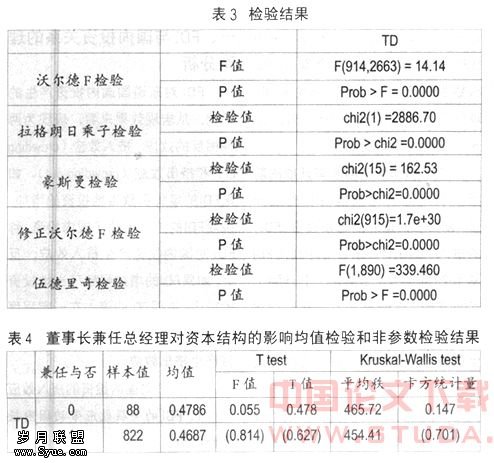 对于董事长兼任总经理是否影响资本结构的选择,作者采用2004年非类上市公司的相关数据,通过独立样本的均值检验和非参数检验进行验证,零假设为总经理兼任董事长与否对资本结构影响不显著。检验结果如表4所示: