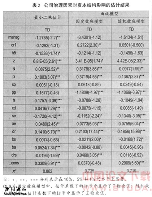 管理者持股比例与总负债率不存在显著关系。这可能是因为我国上市公司管理成持股比例普遍偏 低,样本公司管理层持股比例均值为0.03%。管理层在只拥有极少量股权的情况下,可能会增加负债减少负债的代理成本,也有可能减少负债谋求自身利益最大化,所以管理者持股比例与资本结构选择的关系不明显。