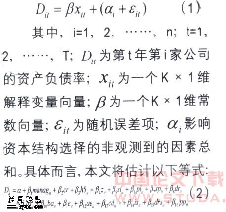 本文将结合我国上市公司资本结构的现状,从公司治理的角度研究其选择问题,在借鉴公司治理相关的基础上(张维迎,1996;李维安,2001;赵蒲、孙爱英,2003),分两条路径研究公司治理因素对资本结构的影响:一条路径强调公司内部产权安排对资本结构的影响,选用管理层持股比例、股权集中度、股东性质、董事会特征等变量作理论与实证分析;另外一条路径是强调外部治理机制对高级管理人员的约束,选用环境、产品竞争市场和公司控制权市场的相关变量作实证分析。