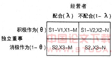作为股东来讲,引入独立董事之后,最好是能使其能够发挥积极作用与经营者相互配合,为共同努力。然而,独立董事的积极作为与否和经营者的合作态度很有关系。在该博弈中,独立董事的战略集仍为E={积极作为,消极作为},并以θ表示其积极作为的机率。经营者的战略集为F={配合,不配合},其配合的机率为λ。我们仍用S来表示独立董事的收益,所需支付的成本为V,显然,有经营者的配合时,其成本相应较低,而在经营者不配合时,其成本较高,所以假设V1X2,且MaxX1N。博弈模型为:
