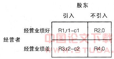 在这一博弈过程中参与人分别是作为企业资产所有者的股东和企业经营者,股东从自身利益出发,总是希望经营者能不断的提高经营业绩,为企业创造更多的利润。而独立董事的引入与企业经营业绩具有一定的正相关关系,所以,对于股东来说,为了进一步提高经营业绩,无论在经营者原有经营业绩好还是坏的前提下,均有可能引入独立董事,在经营业绩差时也有不引入独立董事的可能存在,即股东的战略集可以表示为:A={引入,不引入}。对经营者而言,引入独立董事是一种约束或是压力,在这种压力下,经营者或许更加努力工作改善业绩,或是使企业经营业绩进一步恶化,即经营者的战略集为:B={经营业绩好,经营业绩差}。我们以Ri表示经营者在不同情形下的收益,以ri,ci表示股东在不同情形下引入独立董事的期望收益与应支付成本。如下图所示: