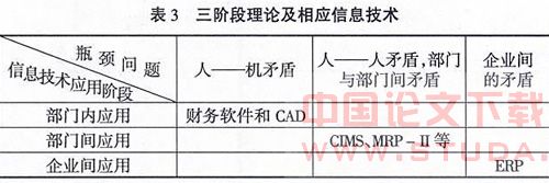 ②按照企业所处的瓶颈阶段来选择。Venkatraman出IT引导企业转变的5个阶段:局部应用、内部集成、业务流程重新设计、经营网络重新设计、经营范围重新设计。浙江大学的李俊等人在Venkatraman提出的阶段理论基础上,根据企业应用信息技术的实际进程,提出了三阶段理论:部门内应用阶段、部门间应用阶段和企业间应用阶段。对于一个成长型的中小企业,要根据企业不同阶段所面临的瓶颈问题,分析自己所处的信息技术应用阶段,合理选择相应的信息技术(见表3)。