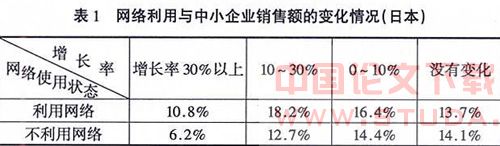 一般来说,信息技术就是应用信息原理方法来研究信息的产生、传递、处理的技术,具体包括有关信息的产生、收集、交换、存储、传输、显示、识别、提取、控制、加工和利用等技术。企业信息化是指企业在生产和经营、管理和决策、研究和开发、市场和销售等方面采用机、通信和等信息技术,建设应用系统和网络,通过对信息和知识资源的有效开发利用,调整和重构企业组织机构和业务模式,服务企业发展目标,提高企业竞争力的过程。信息化的发展可以帮助中小企业降低经营成本,获得更多的市场机会和市场空间,与更多的企业和消费者进行信息的交换,在全球范围内进行采购和销售等。对于那些采用了信息技术来改善经营的中小企业而言,信息化不仅有助于其实现经营资源的整合和有效利用,而且有助于经营效益的改善和提高。以日本为例,在“网络应用与中小企业销售额的变化情况”调查中,那些利用了网络的企业其销售额的增长率要明显高于那些没有使用网络的企业(见表1)。