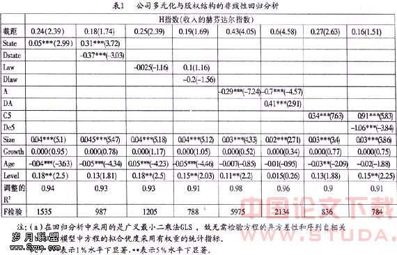 从表1可以看出,国家股比例和公司多元化指标呈倒U型曲线关系,多元化开始随国家股比例的提高而增加,然后又随其比例的提高而下降,这和假设H1相符。法人股和公司多元化呈负相关关系,但结果并不显著,假设H2无法得到证实. 流通A股和公司多元化呈U型曲线关系,多元化程度开始随流通A股的增加而下降,但当流通A股继续增加时,多元化程度便会上升,我们的假设H3得到了证实。股权集中度和公司多元化也呈倒U型曲线关系,多元化开始随股权集中度的提高而上升,然后又随股权集中度的提高而下降,这和假设H4是一致的。表中还可以看出公司规模和多元化程度呈显著正相关,也就是说公司规模越大,越容易实施多元化战略。