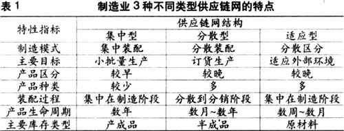 供应链网是由自治或半自治的实体所构成的,它们共同合作,负责管理一个或多个相关产品的采购、生产和分配活动,由于其中的节点常常为多家,并且处于一个多级动态变化的环境之中,它并非一条水平结构的单一线性链条,而是呈现出一个由原材料供应商到制造商、分销商、零售商乃至最终用户构成的结构,根据Fu RL.,Shaw J.(1998)提出的七项结构特性指标,即制造特性、业务目标、生产的差异、产品模式、装配阶段、产品生命周期及库存需求,可以将制造企业的供应链网分为集中型、分散型和适应型。其特点如表1所示: