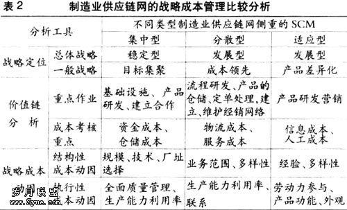 制造业供应链网的战略成本管理比较分析如表2所示: