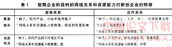 前期企业阶段的资源、能力是否可以顺利为新创企业带来新的资源、能力和网络关系,跟新创企业与前期企业间存在的关系性质有关;如果是联盟或合作的关系,这种资源、能力和网络关系的转移会是顺利且比较充分的;如果是相同产品与目标市场、甚至是相同的客户的竞争关系,则这种转移将是比较困难的;在这两个极端情况之间则是各种不同程度的情况。另一个影响因素是两者的产业相关性:产业相关程度愈高,则创业者在之前所积累的网络关系和资源能力的可移转性愈高。以关系性质的竞合和相关程度两个构面来分析(如表1所示):当两者的关系是处于高度相关的竞争性质,则网络关系和资源能力转移的可能性是最低的;如果是低度相关的竞争关系-例如目标市场的地区重叠性低,则转移的可能性会较高;转移程度最高的是高度的合作关系,转移程度中等的是低度合作关系。