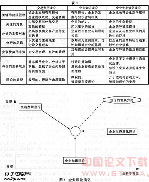 各类企业理论从微观到宏观,从经济学特征到生物学特征,这与其他的理论研究颇为相似。诸如研究人,首先从其生物学特征出发,研究微观的个体,然后研究到人群社会,研究其经济学特征和宏观共性,最后在这些极端研究当中逐步趋向于各家的融合。企业理论的探讨和研究同样具有这样的倾向。图1说明了目前三个理论在研究构架上的位置,并指出了今后理论研究的发展方向,供大家探讨。