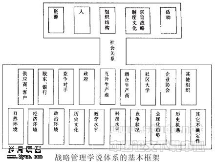 ??毫无疑问,这是对战略管理理论提出的重大挑战。战略管说体系探讨。从实践的观点看,战略制定需要科学的战略管理理论的指导(虽然战略理论和战略实践是互动的),而战略管理理论的科学性又是战略管理作为一门学科存在的最终的理由。明显的道理是:以一个片面的战略管理理论(如资源论或价值链理论)来指导战略制定,是注定要失败的;完善战略管理理论是制定有效战略的一个基本条件。从现有战略管理理论看,都是涉及对内外部因素及企业社会关系的分析,综合现有的战略管理理论,本文归纳出一个战略管理学说体系的基本框架。如下图: