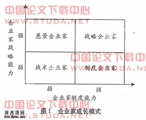 企业家是指具备企业家能力和应用这些能力所需的资源配置权的企业经营者,企业家模式是以企业家能力结构中的主导性能力为主要划分依据的企业家行为集合。根据制度能力和战略能力的强弱,可以用图1划分四种企业家成长模式(项国鹏,2006)。