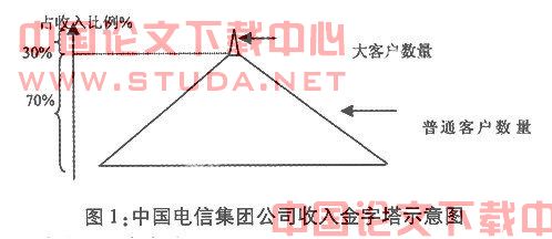 从收入金字塔看(见图1),金字塔上端是尖而窄的,中下端是跨度大而宽的。由于服务能力和服务成本的制约,一般地,中国电信集团公司把各地占通信收入20%-30%的前端客户作为关键客户即大客户来服务。