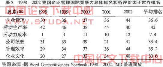 从表3可以看出,1998—2002年间,我国企业国际竞争力总体排名落后,且呈下滑趋势,竞争压力很大。企业管理竞争力从 1998年的第 3O名下降到 2002年的第 44名,平均排名 36.6,竞争力很弱。在影响企业国际竞争力的几个子要素中,只有劳动力成本竞争力最强,五年来平均排名7.4。