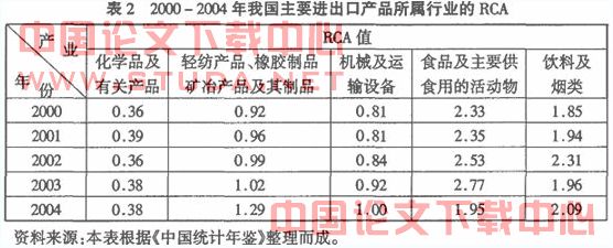 企业国际竞争力是产业国际竞争力的微观基础,产业国际竞争力是企业国际竞争力的宏观体现,而产业及企业的国际竞争力又具体体现在产品的国际竞争力上。因此,从我国产业及产品的国际竞争力的相对优劣可以判别我国企业国际竞争力的强弱情况。一般来说,产业(产品)国际竞争力可以用显性比较优势指数法来确定。显性比较优势指数的公式为: RCA =(EXi/IM~)/(EXT/IMT) (1其中,EXi和啦表示 i行业某年的出口额和进口额,而 EXT和 IMT则表示一国(或一地区)某年的进出口总额。RC 大于 1表示 i相对于其他部门在国际贸易中具备比较优势,R值越大则优势越明显。据公式(1)可以计算出我国几大典型产业的显性比较优势指数,如表 2。