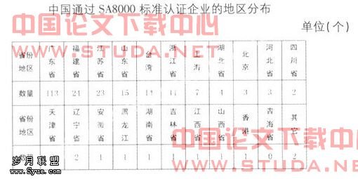 而通过SA8000标准认证的企业在地区分布和行业分布上存在着明显的不均衡性特征。在地区分布上,东南沿海地区明显比其它地区通过SA8000标准的企业要多(详见下表),对SA8000标准的重视程度也要高一些;在行业分布上,更多地聚集在制造型企业上。