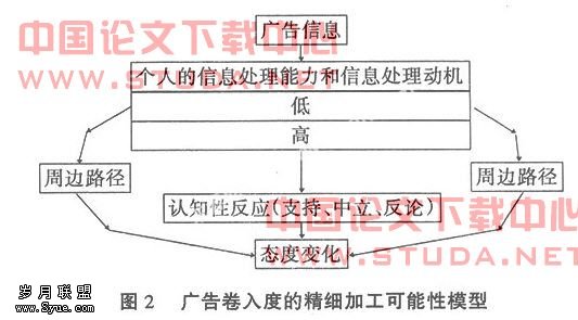 2.广告卷入度。1986年由Petty和Cacioppo提出了关于广告卷入度研究的精细加工可能性模型ELM(Elaboration Likeli-hood Model)。这一理论模型把消费者态度改变归纳为中枢路径和边缘路径两个基本路径。中枢路径把态度改变看成是消费者认真考虑和综合信息的结果,即消费者进行精细的信息加工,综合多方面的信息,分析、判断广告商品的性能与证据。边缘路径认为态度的改变不在于考虑商品本身的性能及证据,不进行逻辑推理,而是根据广告中的一些线索。如图2所示。