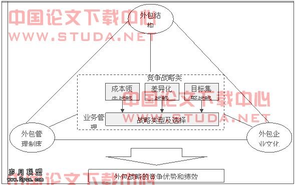 目标是要尽可能的降低总成本,对原材料在制品或者是制成品的库存进行地理上的定位。涉及到信息、运输、存货、仓储、材料搬运和包装等各方面的集成。就具体企业来说,根据业务类型、作业的地理区域、产品和材料的重量和价值比率,支出一般占销售额的5%-35%之间。成本通常被解释为业务工作中非常重要的成本之一,仅次于制造过程中的物料费用或图1 外包战略模式与竞争优势的关系示意图批发、零售产品的成本。
