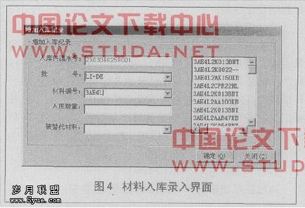 该公司的材料种类很多,而材材料的编码较长,般都有13个字符。因此在材料入库时,如果是手工输入材料-编码,不仅速度慢,而且容易输错,如果是采用下拉列表式进行选择,因为材料种类繁多,速度也很’漫。所以为了材料编号录入的方便,在录入界面中增加了个显示列表如图4所示