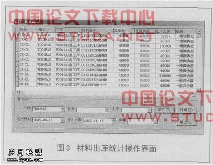 材料出库统计是对任时间段内的材料出库情况的查询统计。其操作界而如图3所示,图中显示了V D045AS机种在2002年6 月17日到2002年11月17日时间段内的套料出库情况。