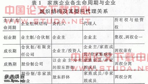 家族企业在其发展的初期由于规模小、易于管理,因此发展迅速。但随着家族企业经营规模的扩大、经营领域的拓宽,家族制管理模式的弊端就会逐步暴露出来。例如,家族内部有限的资金、人才资源难以满足企业的扩张需要;企业家集权领导,难以保障决策的化;在用人问题上,长期以来陷入“先家族后企业”的怪圈,过于考虑家族成员的利益,严重挫伤了其他员工的工作积极性;家族和非家族成员的双重判断标准,使企业难以获得社会的认同;家族成员间利益及经营理念的冲突,导致企业严重内耗等等。这些潜在弊端的不断显现,无不说明在企业发展到一定规模后,若还固守原来的家族制管理模式,则必然会严重阻碍企业的进一步发展。根据企业生命周期理论,有关学者就家族企业生命周期与其组织结构和委托代理模式的演进得出如下结论(见表1):?