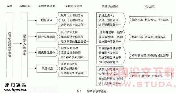 图1以航空公司服务类指标——客户满意率指标为例,说明每一项KPI指标依据的关键因素和流程选取和制定的过程。