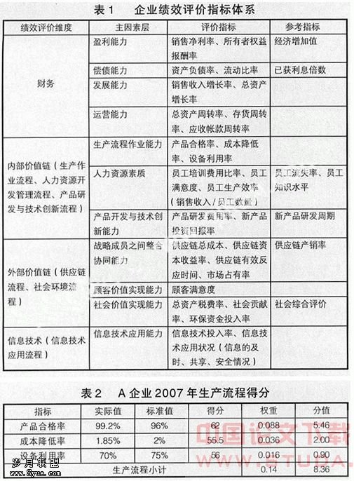 在对前期收集整理的各指标实际值与预算值基础上,分别进行标准化处理,然后将计算结果乘以相应的指标权重,计算出单项指标得分、流程的得分与绩效评价总分。用这种方法分别计算出财务、生产流程、人力资源管理流程、产品开发创新流程、供应链流程、社会环境流程、信息技术应用流程的单项指标得分、流程得分,例如2007年的生产流程单项指标得分、流程得分如表2所示,这年度绩效评价合计是65.84。