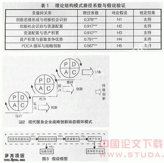 图2循环中P(plan)代表创造性思维形成,在此阶段企业需要用敏锐的头脑和现代技术搜集关于服务的数据,进而形成创造性思维;D(do)代表创新机会识别,这一阶段,企业要分析上一阶段搜集到的关于服务的数据,并在动荡、混沌的环境中发现创新机会,然后根据自身企业的实际需要,筛选出最有利于企业的创新机会;C(check)代表资源整合,企业要检查自身的资源配置情况,找出与同行业资源的差距,并及时弥补差距,这一阶段需要企业能力和更好的实践;A(act)代表资产积累,这一阶段企业要在资源配置的基础上,不断的积累能力,从而达到创新的目的,并积累能力来维持创新和获得进一步创新。本研究假设 H5:创造性思维形成、创新机会识别、资源整合和资产积累四个阶段不断的循环上升与现代服务企业战略创新正相关性很大。假设模型如图3。